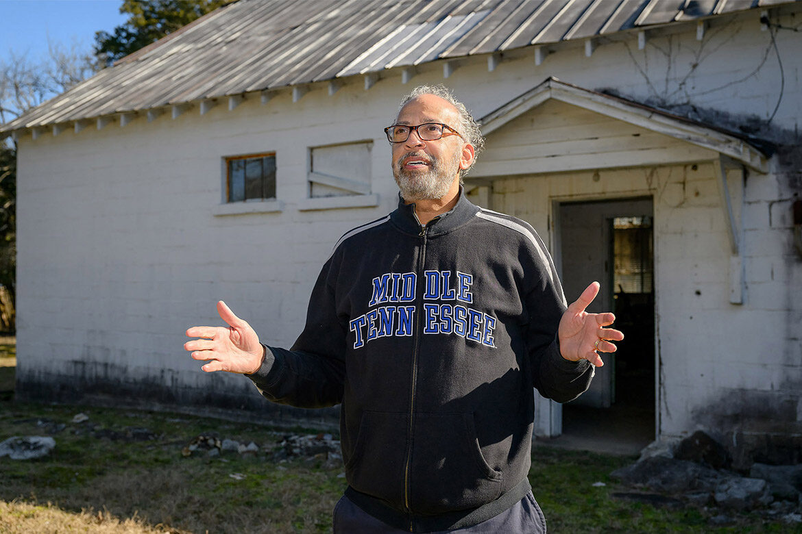 Middle Tennessee State University alumnus and former administrator Vincent Windrow stands in front of The Cemetery School, located off Old…